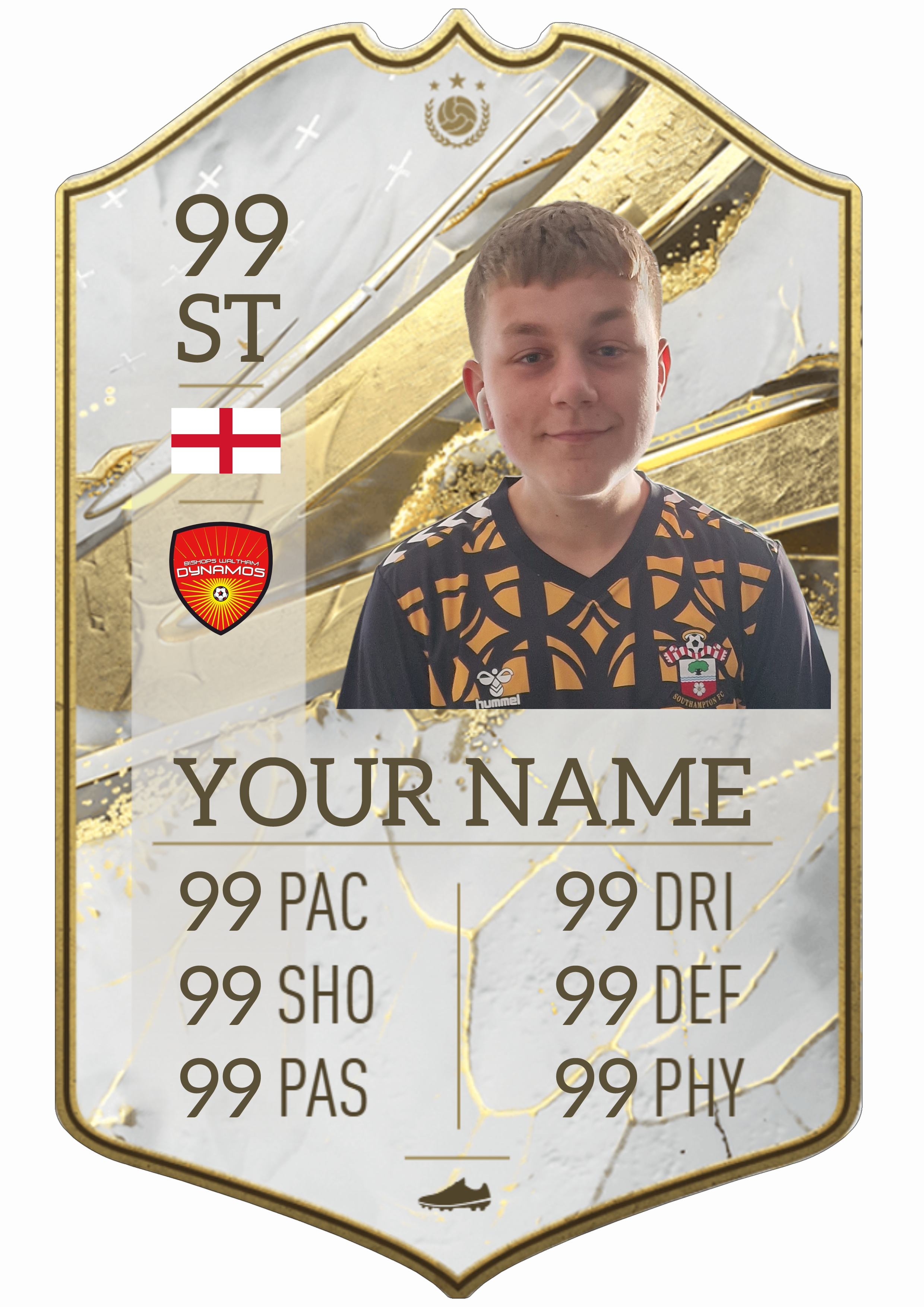 A4 (175 x 283 mm x 0.5mm) metal player shield, perfect for football lovers and players – print it up for young fans with their own stats!