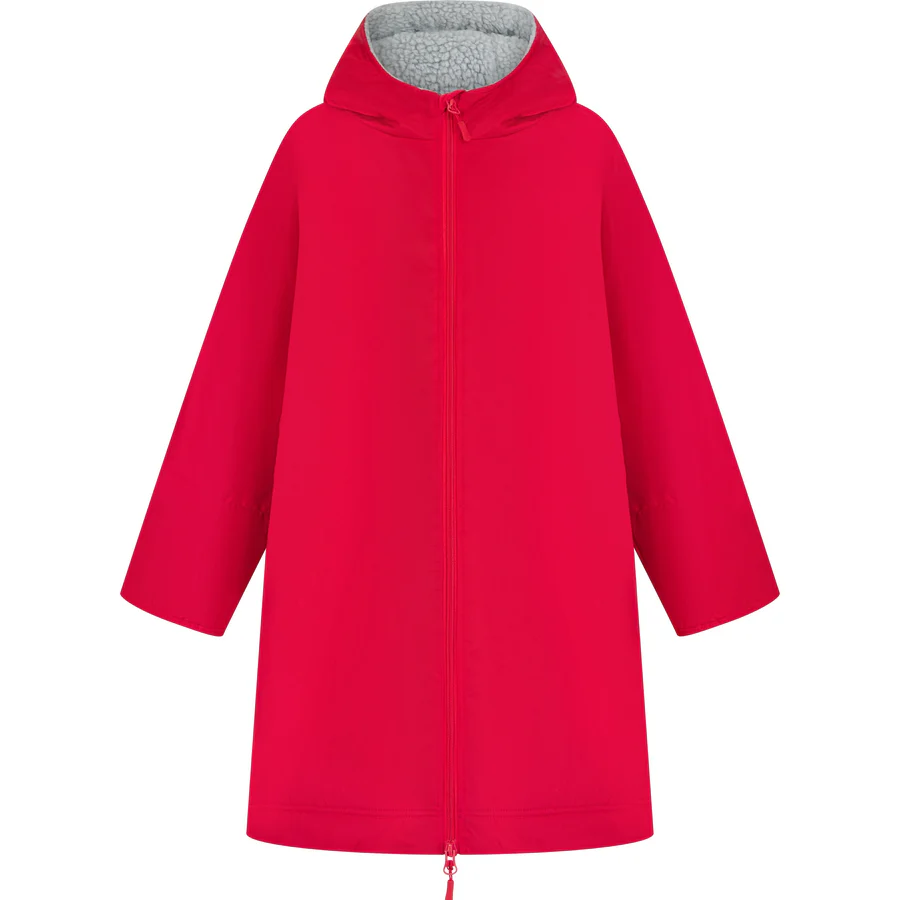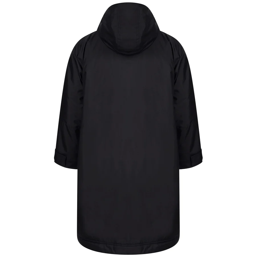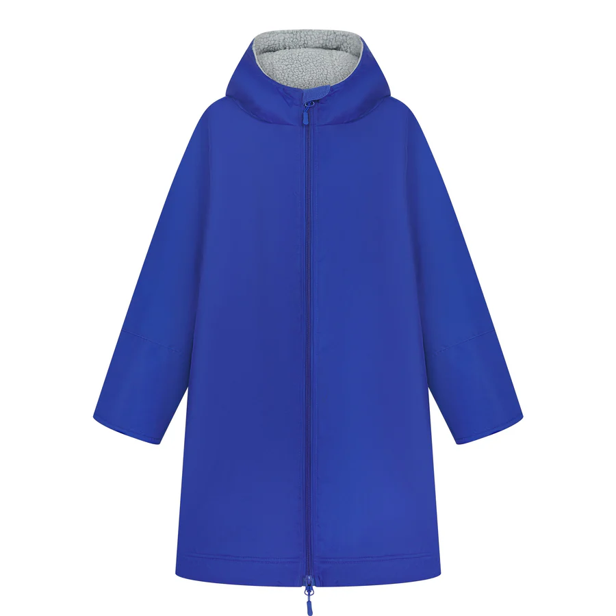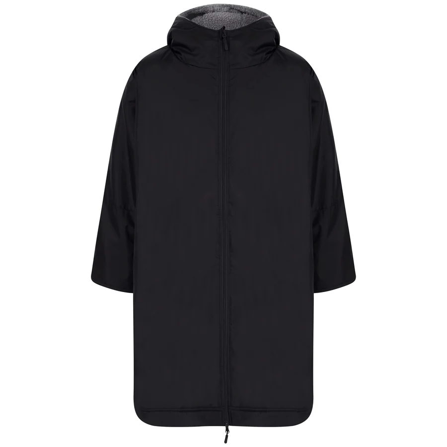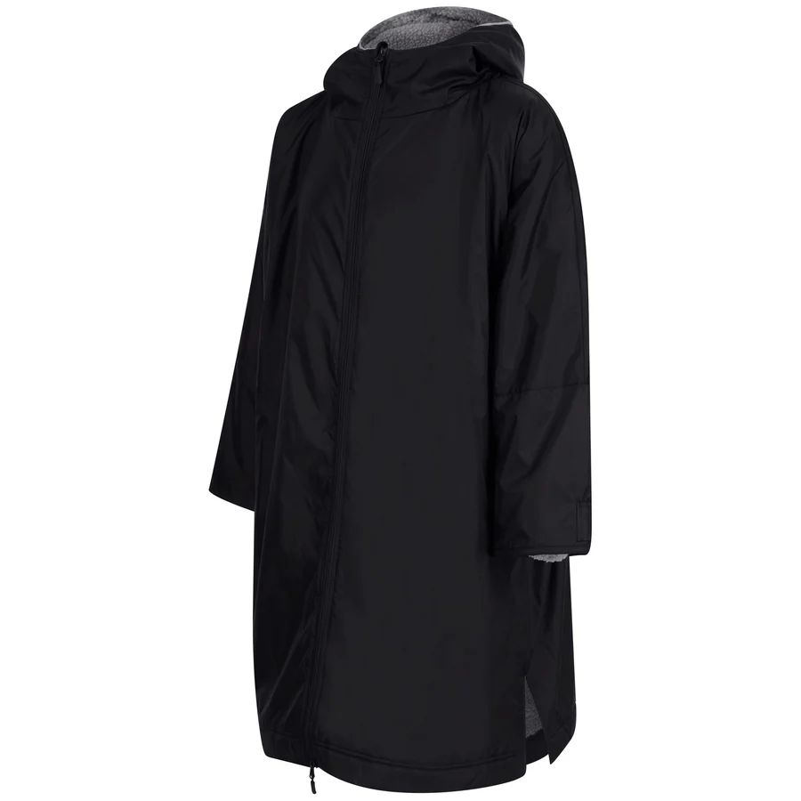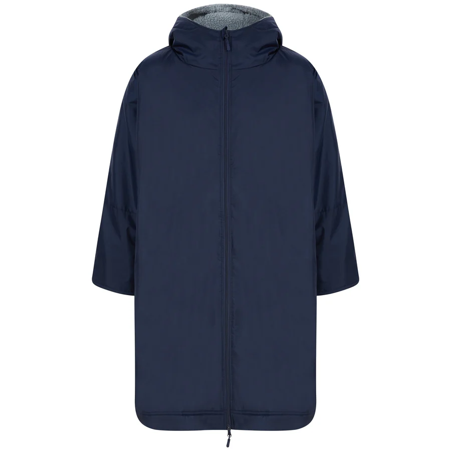 The ultimate team robe is made in a water resistant fabric with a cosy sherpa fleece lining and three-piece hood. The roomy fit with double-ended full front zip allows wearers to keep warm and get changed underneath the robe. Perfect for wild swimming or wearing on team sidelines. Zipped pockets with fleece lining keep hands warm with multiple inner pockets for keeping belongings safe. Topped off with a large embroidery zip for access to directly decorate.